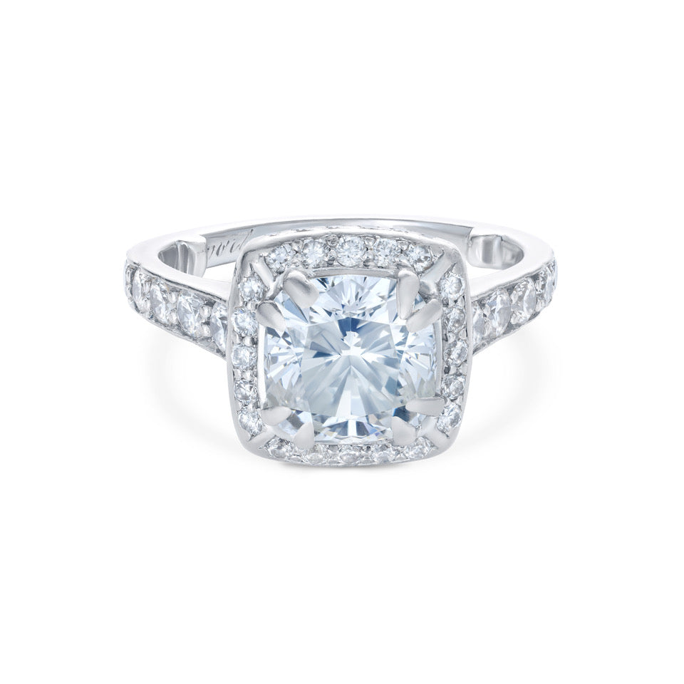 A cushion cut diamond ring mounted in platinum