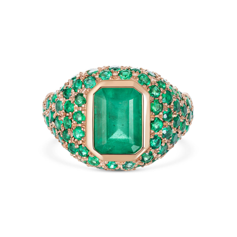 An emerald cut emerald ring mounted in 18K rose gold